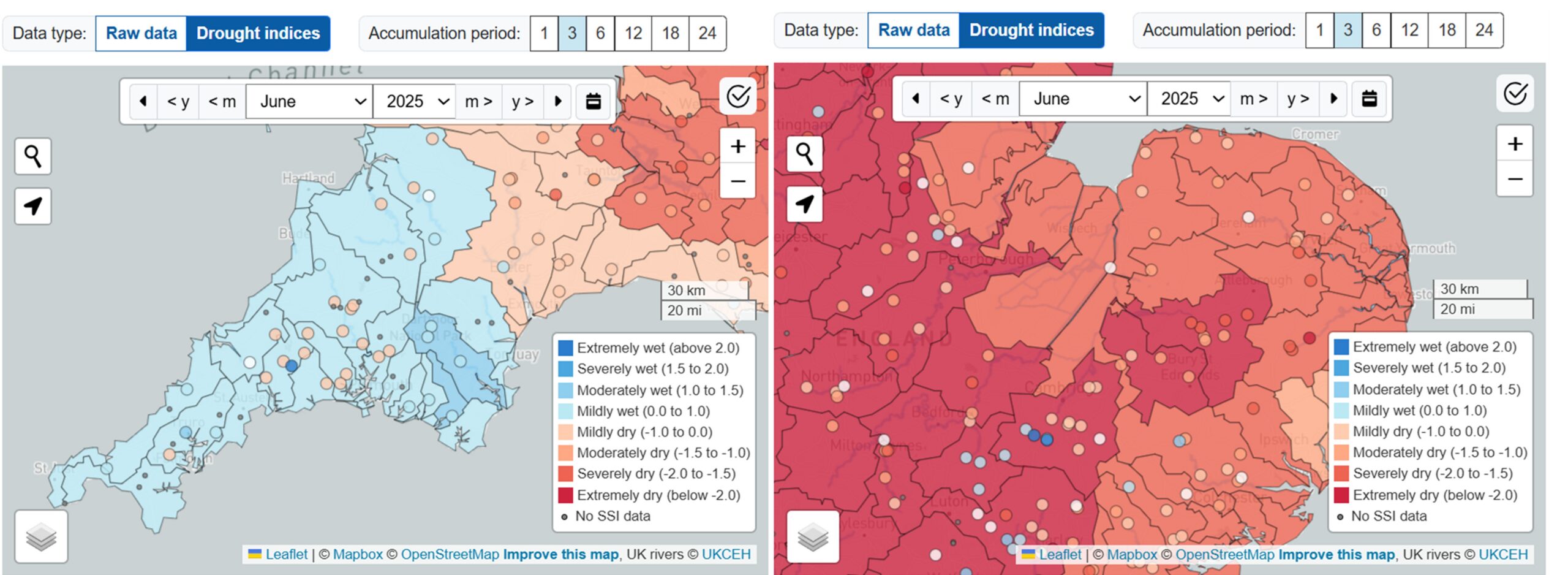 Example of two different drought profiles across England in June 2025. The first map shows mildly wet and mildly dry 3-month Standard Precipitation Index values for parts of the South West. The second map shows severely and extremely dry 3-month Standard Precipitation Index values for parts of East Anglia during the same period. Source: UK Water Resource Portal, UK Centre for Ecology and Hydrology